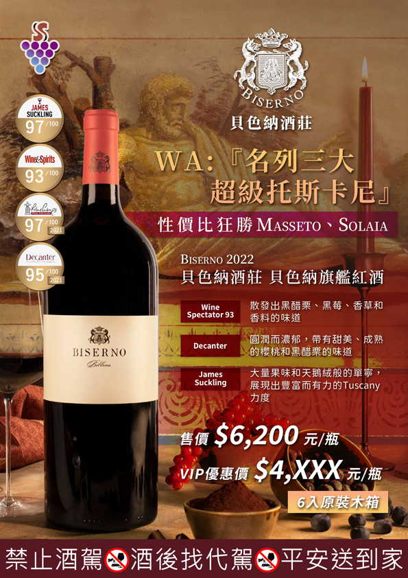 《Wine Advocate》曾點名Masseto、Solaia、和我們的Biserno貝色納紅酒,並列超級托斯卡尼三大!但你知道嗎?真正義酒行家第一首選是Biserno!Biserno只需大約Masseto五分之一及Solaia二分之一價即可入手,性價比完全大勝!