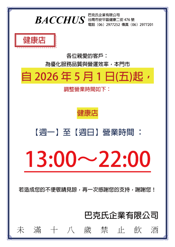 為優化服務品質與營運效率,自2026年5月份起,三家門市營業時間調整,營業時間如以下