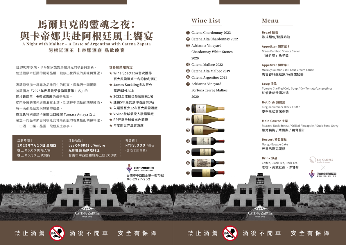 阿根廷酒王✦卡帝娜酒廠品飲晚宴