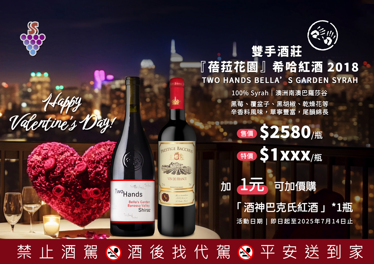 情人節特惠 雙手「蓓菈花園」希哈紅酒 送酒神巴克氏紅酒