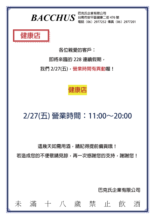 2026⎚二二八┇營業時間異動公告