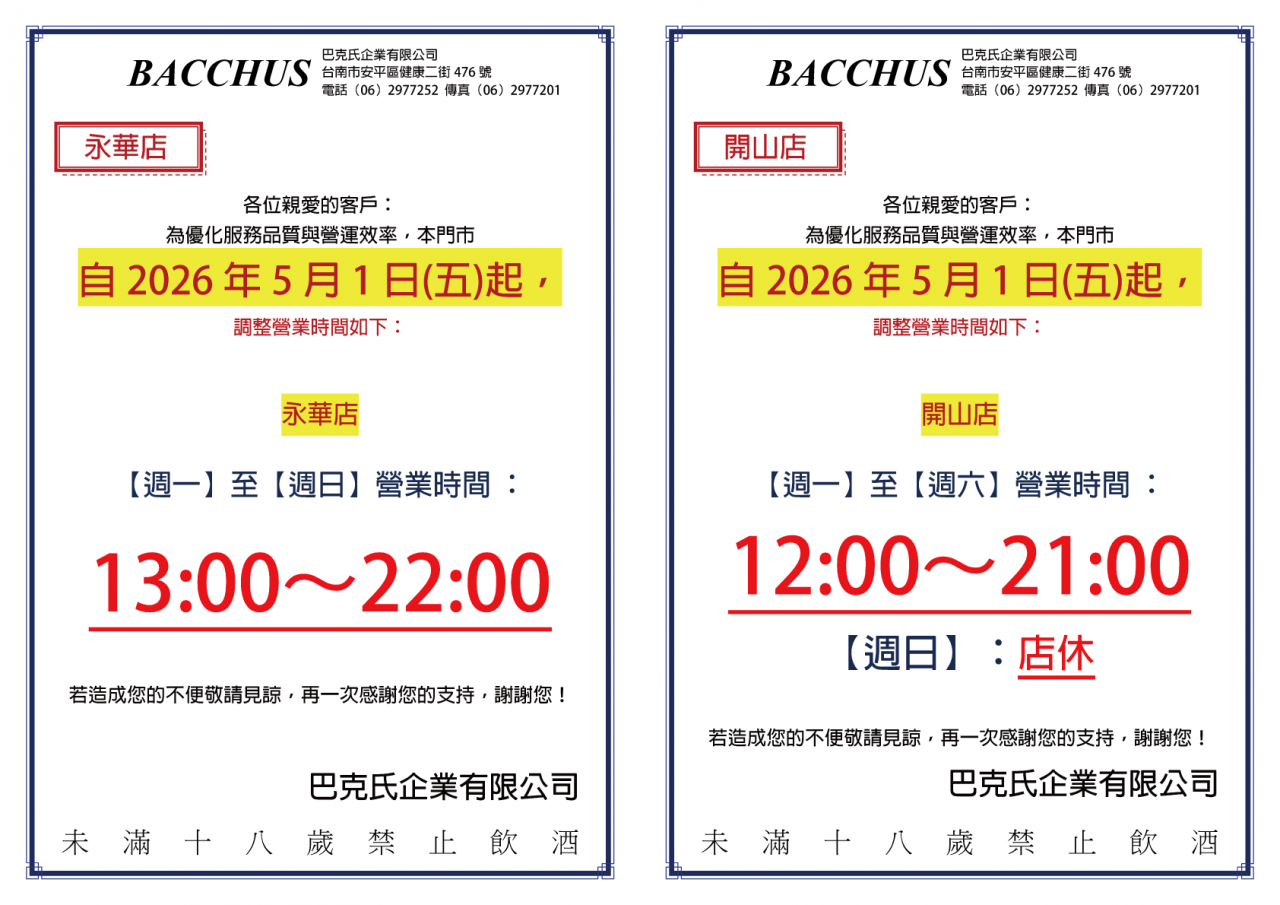 為優化服務品質與營運效率,自2026年5月份起,三家門市營業時間調整,營業時間如以下